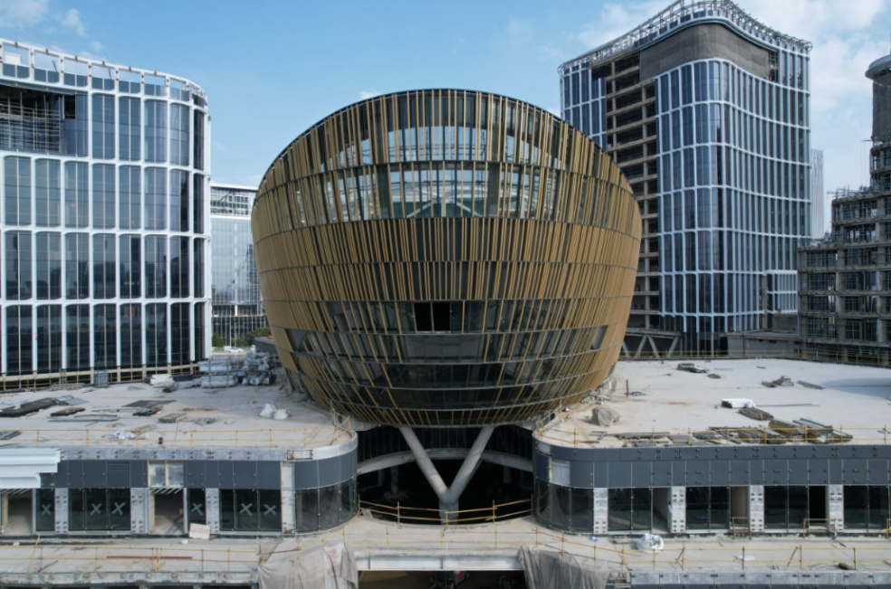 从空中俯瞰,多功能文化演艺中心建筑形如一艘大船,静静地停泊在黄浦江畔,从前滩的“源头”扬帆启航,驶向大江大河。目前,该建筑正进行外立面装饰装修,金色“皮肤”在阳光下熠熠生辉。