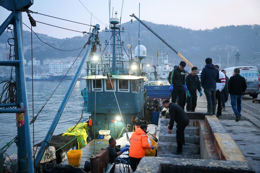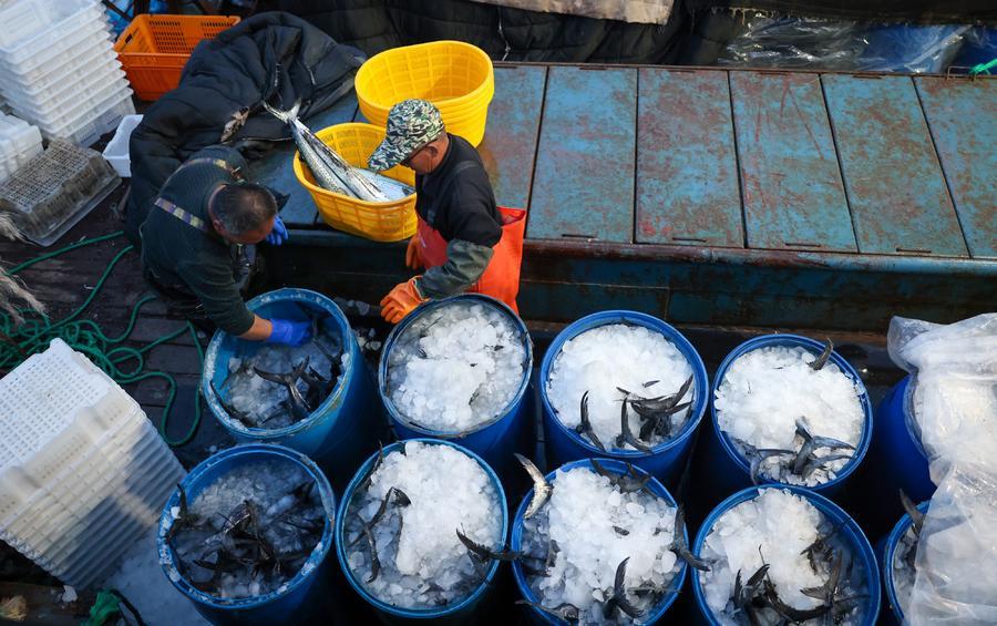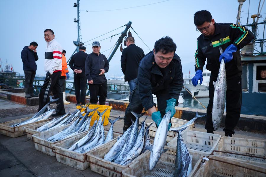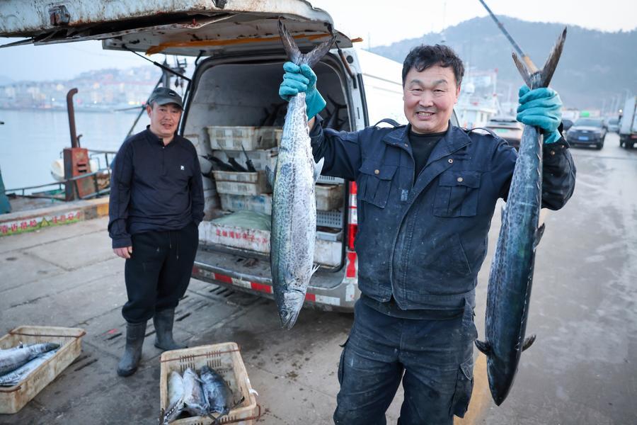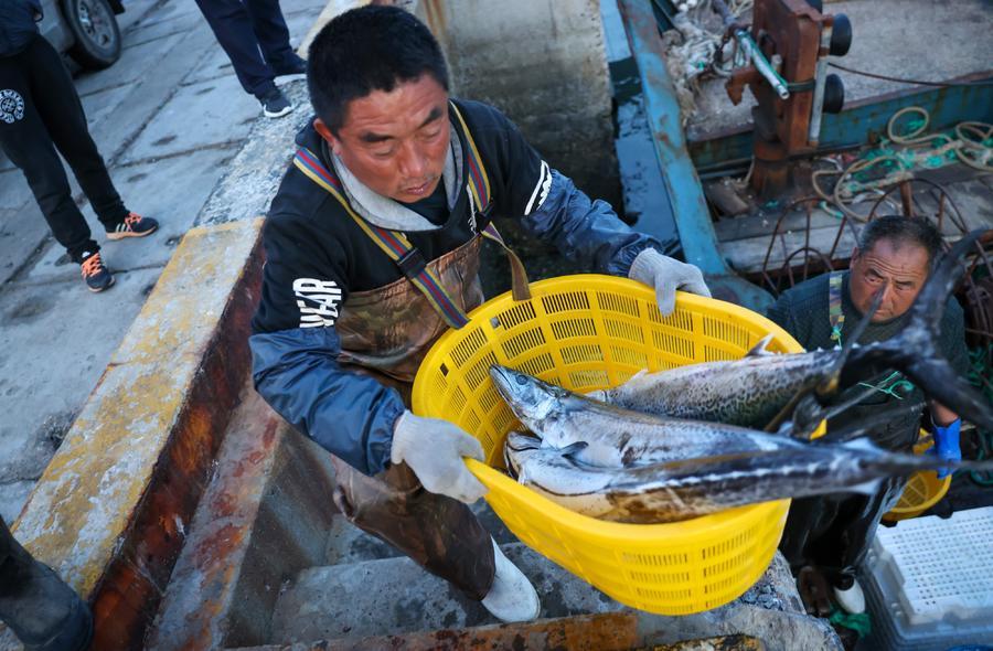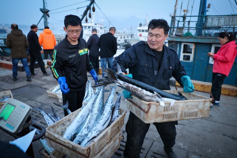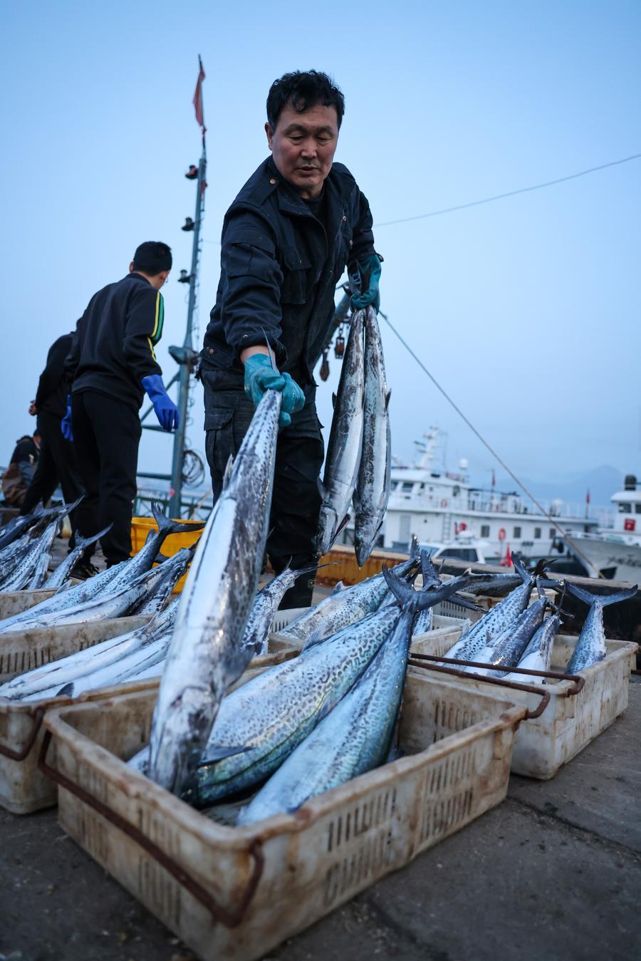 4月19日清晨,青岛沙子口国家中心渔港内,来自浮山所市场的老韩正在上货。老韩凌晨三点就来到码头,批发了大约800斤鲅鱼。