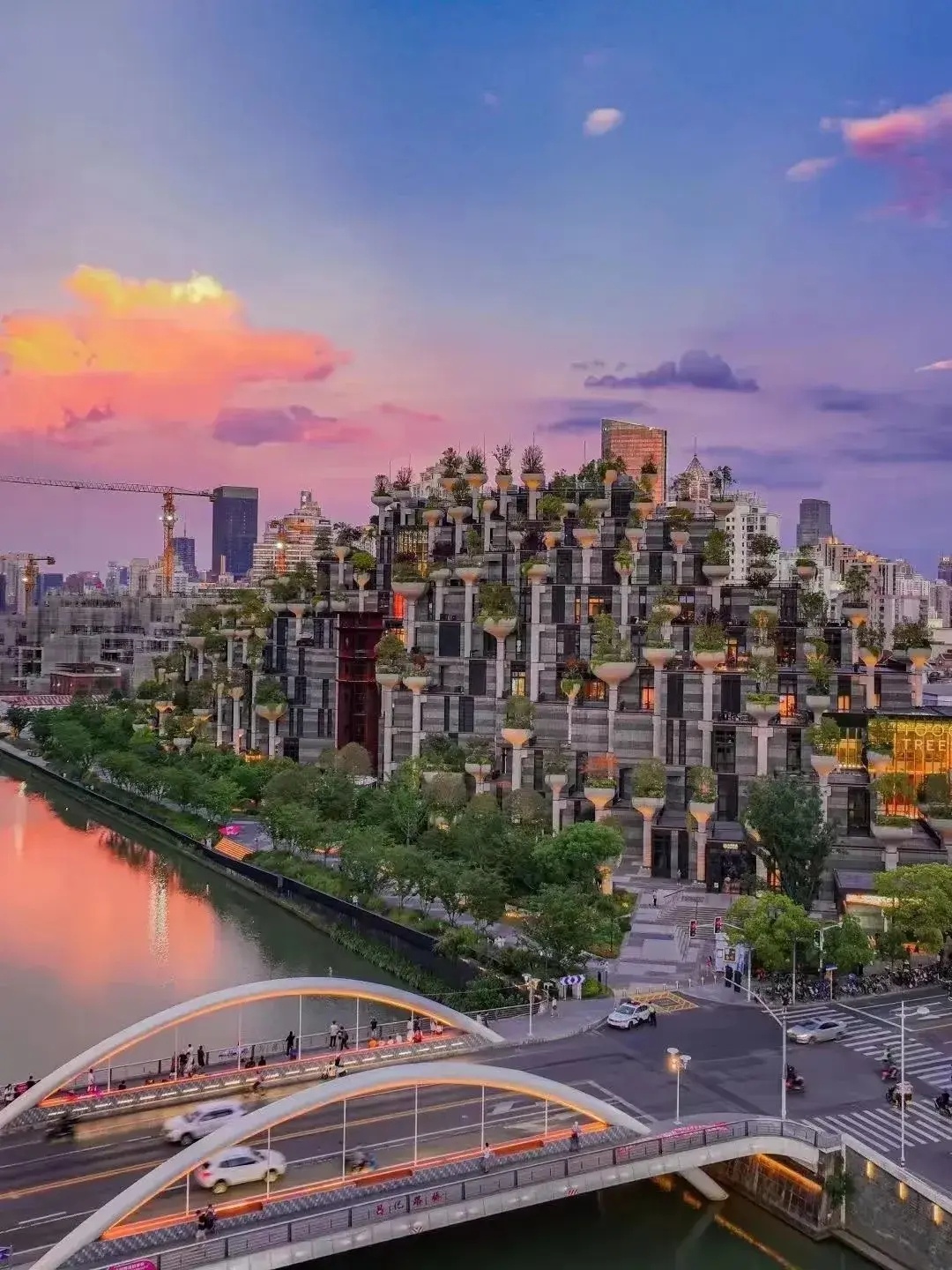 建筑以黄山为灵感,高低错落地分布着阶梯式景观露台和种满植物的立柱,远远看去就像嶙峋山峰间的一抹抹苍翠,令人身处都市之中也能体验到人文与自然相结合的奇妙感受。
