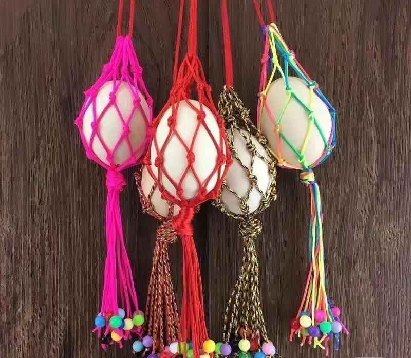 立夏在民间有吃蛋、挂蛋、斗蛋的习俗。立夏挂蛋的习俗源于一个神话传说:传说每年立夏,瘟神都会到人间传播“疰夏”这个疾病。于是,老百姓便向女娲娘娘祈求消灾降福,保佑后代。女娲娘娘托梦告诉老百姓,在立夏之日,小孩子的胸前挂上煮熟的鸡鸭鹅蛋,可避免疰夏。自此,江南一带就有了“立夏胸挂蛋,小人疰夏难”的习俗。长辈会给孩子的脖子上挂上一个用彩线编织的蛋兜装的鸡蛋,这承载了长辈对于后辈的关爱和祝福。