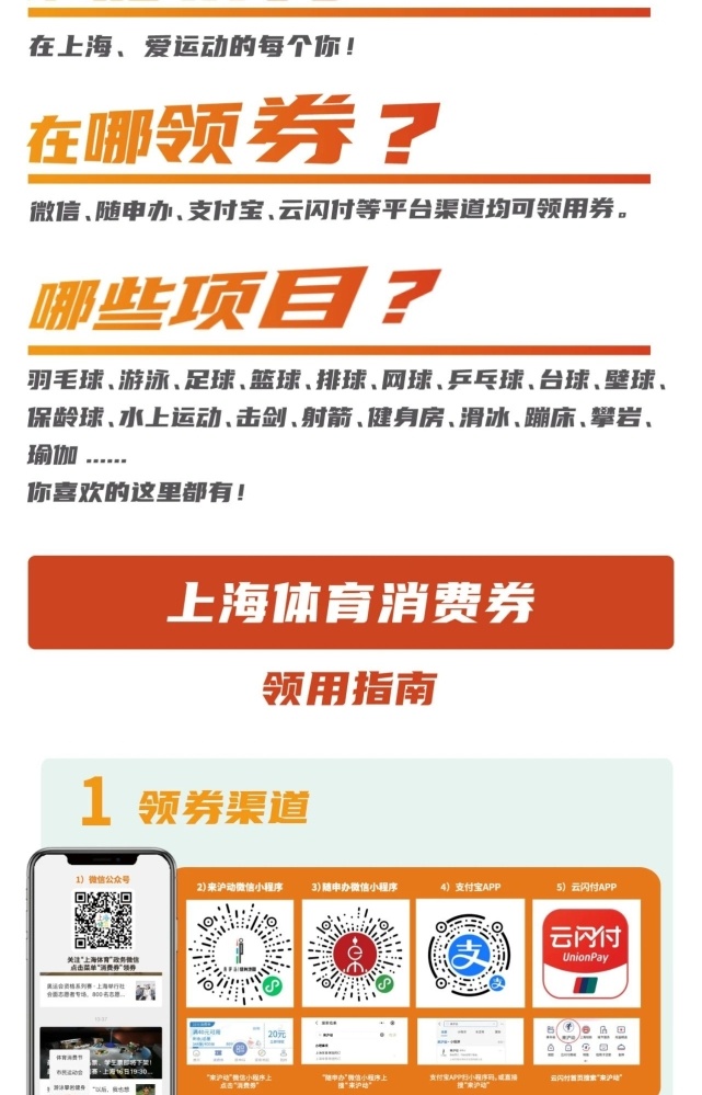 市民可通过微信、支付宝、云闪付、随申办微信小程序等渠道领取及使用体育消费券,体育消费券的面值和类型多样,以支持大众健身消费为主,兼顾不同价位、不同项目的消费需求,不仅包括5元至80元六种不同面值的通用券,还有助老、游泳、冰雪运动、羽毛球、都市运动中心等针对特定运动项目、特定人群的专项券,鼓励相关体育场馆为市民提供多样化、个性化的健身服务。