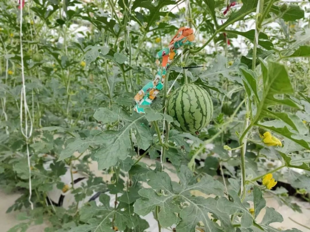 不仅是小番茄,今年,基地的西瓜种植预计也将迎来丰产。通过前期的精准管控,陆东升严格疏果筛选,每棵瓜藤上仅保留一颗西瓜,目前种植的小皇冠、小兰、8424等西瓜品种长势良好,最快的预计今年5月可以上市。
