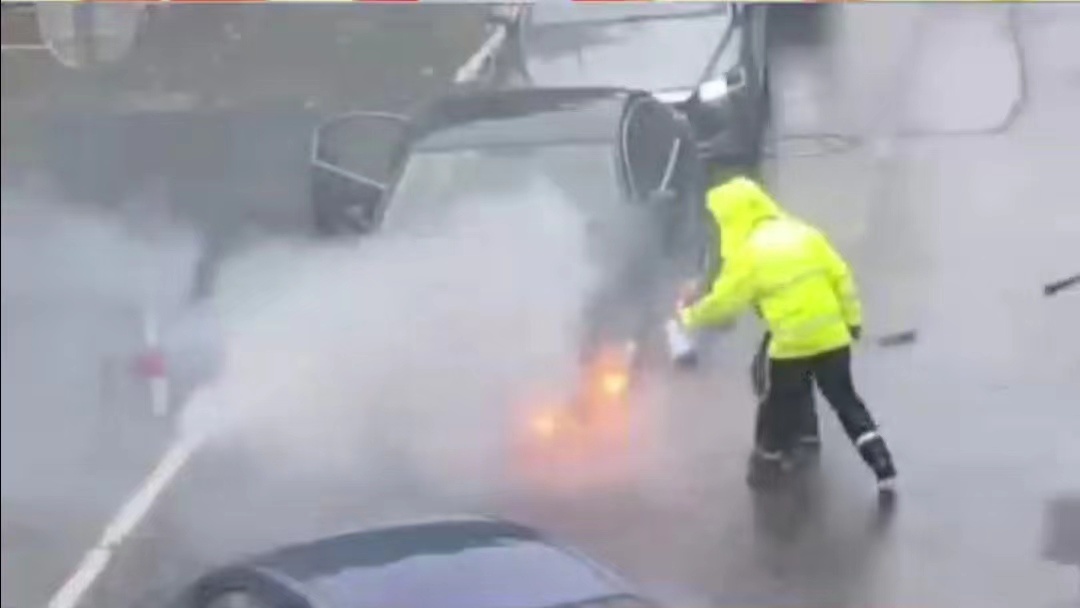 现场,两名辅警分工协作,袁琛鑫负责疏散周边群众,疏导排队的其他车辆驶出危险区域,钱耀彬从医院保安室借来灭火设备实施救火。另有两位热心车主从自己的车内取出灭火器,一起加入合力灭火。