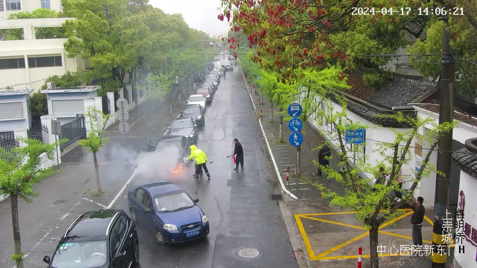 “快来人,快来人,帮我一起救火。”4月17日14时许,崇明东门路近江堤边,一辆辆私家车正排队等待进入上海健康医学院附属崇明医院,此时,其中一辆轿车发动机出现自燃,车主一边拿着衣物扑火,一边呼救。