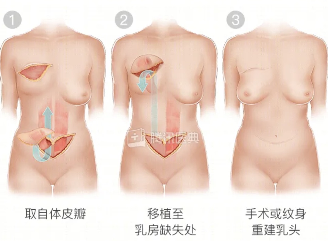 乳房重建术:在乳房切除术和乳房肿瘤切除术后,有一部分患者选择重建乳房,乳房重建是重塑美丽的主要手段,常见的方式有植入物乳房重建、自体组织乳房重建和植入物联合自体重建。重建可以与切除肿瘤的手术同时进行,称为即时重建(I期重建);也可以在几个月至几年后进行,称为延时重建(II期重建)。延时重建时,患者度过了最易复发的时期,比较安心。有些女性决定不重建或选择假乳。
