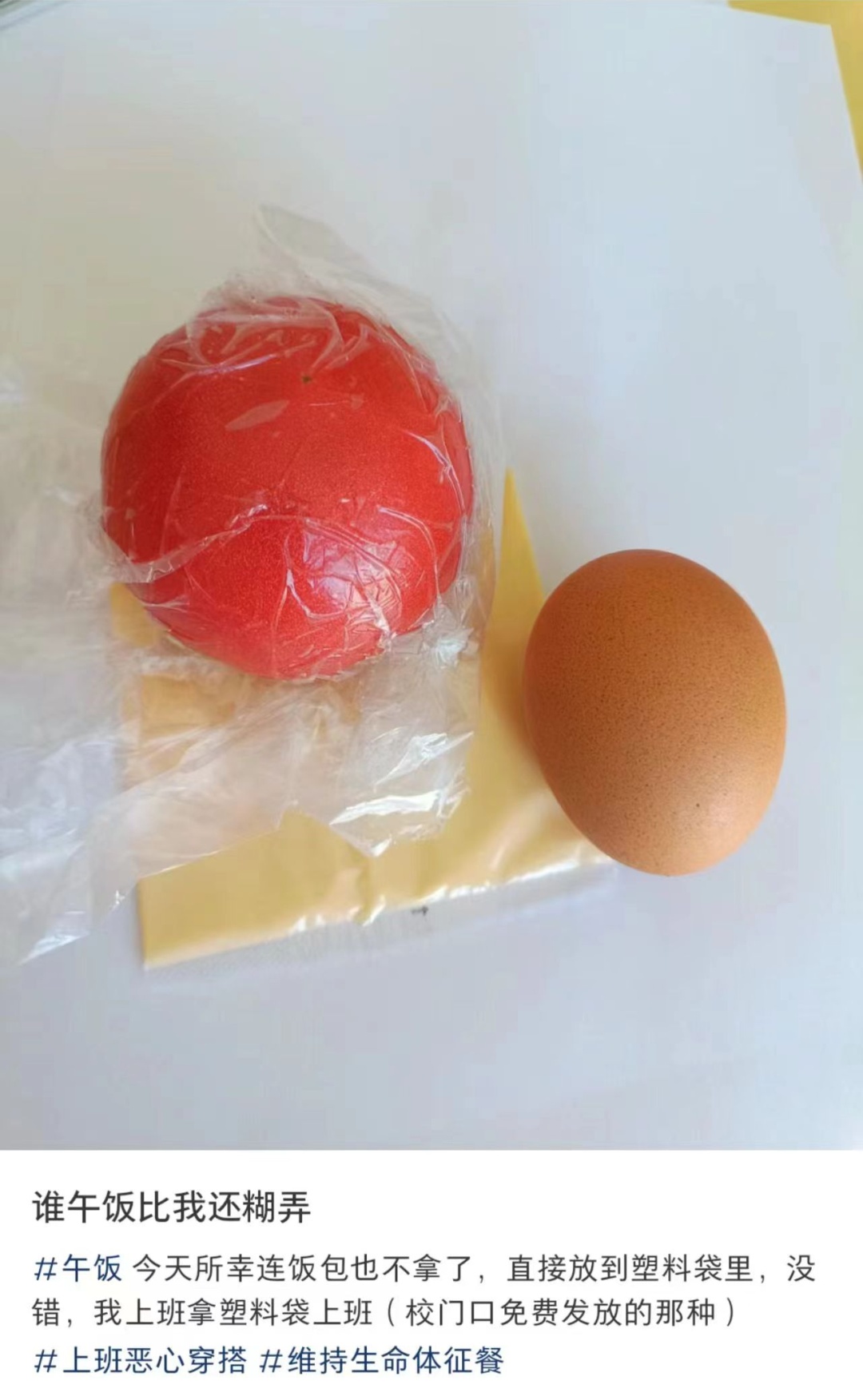 青年报·青春上海记者在社交媒体平台上发现,不少网友纷纷晒出自己的极简风工作餐。小红书上相关帖子超过6万个,微博上相关话题同样超过1亿阅读。