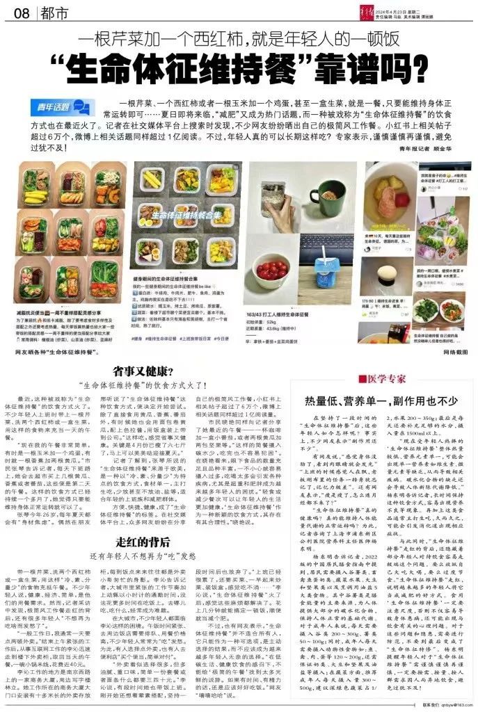 市民晓艳同样向记者分享了她最近的午餐——一杯咖啡加一盒小番茄,或者两根黄瓜加两包坚果等。“这样的简餐摄入碳水少,吃完也不容易犯困”。在晓艳看来,眼下食品的数量充足且品种丰富,一不小心就容易摄入过多,吃喝太多会引发各种疾病,超重和肥胖成为越来越多年轻人的困扰。“轻食或减少餐次可以让年轻人的生活更加健康,‘生命体征维持餐’作为一种新颖的饮食方式,其存在有其合理性。”晓艳说。