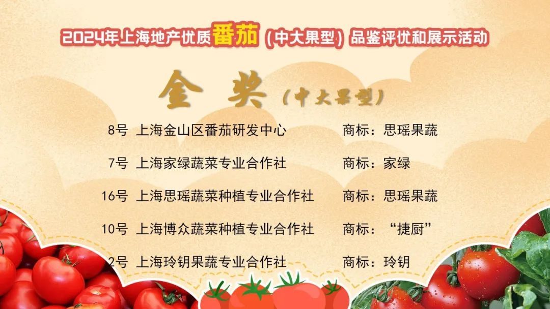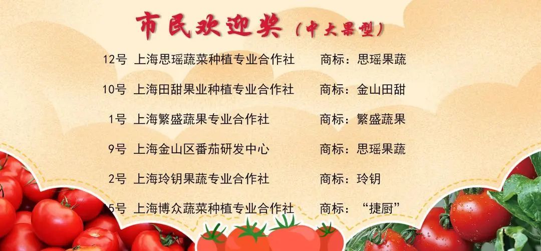 经专家评委和市民评委对19家生产主体选送的14个中果番茄样品和21个大果番茄样品进行综合评定,上海金山区番茄研究中心、上海家绿蔬菜专业合作社、上海思瑶蔬菜种植专业合作社、上海博众蔬菜种植专业合作社、上海玲钥果蔬专业合作社(中果型2家、大果型3家)选送的产品荣获本次品鉴评优活动金奖;上海思瑶蔬菜种植专业合作社、上海田甜果业种植专业合作社、上海繁盛蔬果专业合作社、上海金山区番茄研发中心、上海玲钥果蔬专业合作社、上海博众蔬菜种植专业合作社(中果型3家、大果型3家)选送的产品获评市民欢迎奖。市农业农村委党组成员、副主任陆峥嵘出席活动并为获得金奖的单位颁奖。