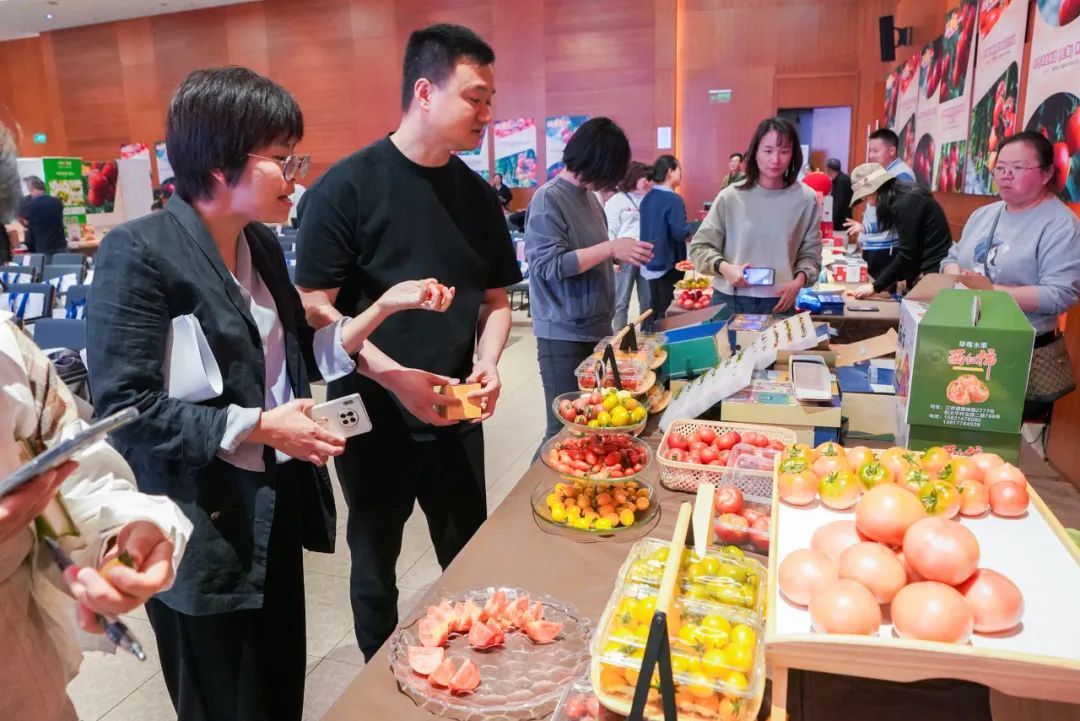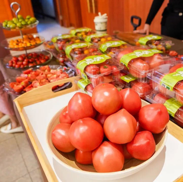 现场还同步进行全市优质番茄展示活动,来自43家经营主体的番茄展品在会场一字排开,大小番茄们齐聚一堂,红得热烈、黄得含蓄、绿得独特……各色番茄被放置在各式摆台中进行展示,编织提篮、玻璃盘、精装礼盒,一应俱全,不得不让人惊叹,番茄也能“玩出花样来”。