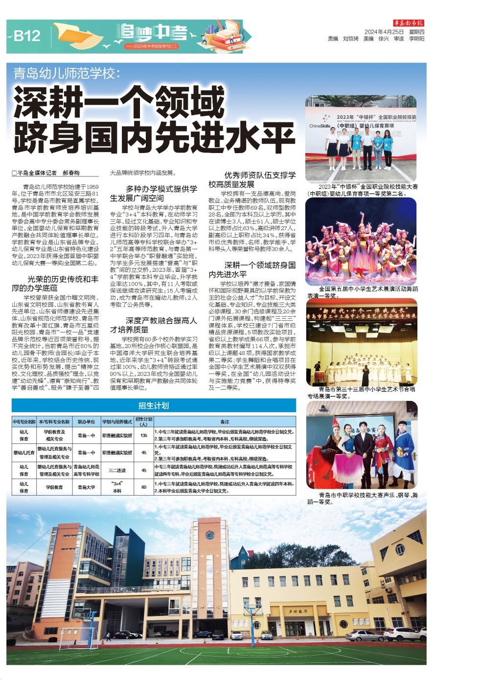 学校与青岛大学举办学前教育专业“3+4”本科教育,在幼师学习三年,经过文化基础、专业知识和专业技能的转段考试,升入青岛大学进行本科阶段学习四年。与青岛幼儿师范高等专科学校联合举办“3+2”五年高等师范教育。与青岛第一中学联合举办“职普融通”实验班,为学生多元发展搭建“普高”与“职教”间的立交桥。2023年,首届“3+4”学前教育本科专业毕业,升学就业率达100%,其中,有11人考取或保送继续攻读研究生;15人考编成功,成为青岛市在编幼儿教师; 2人考取了公务员等。