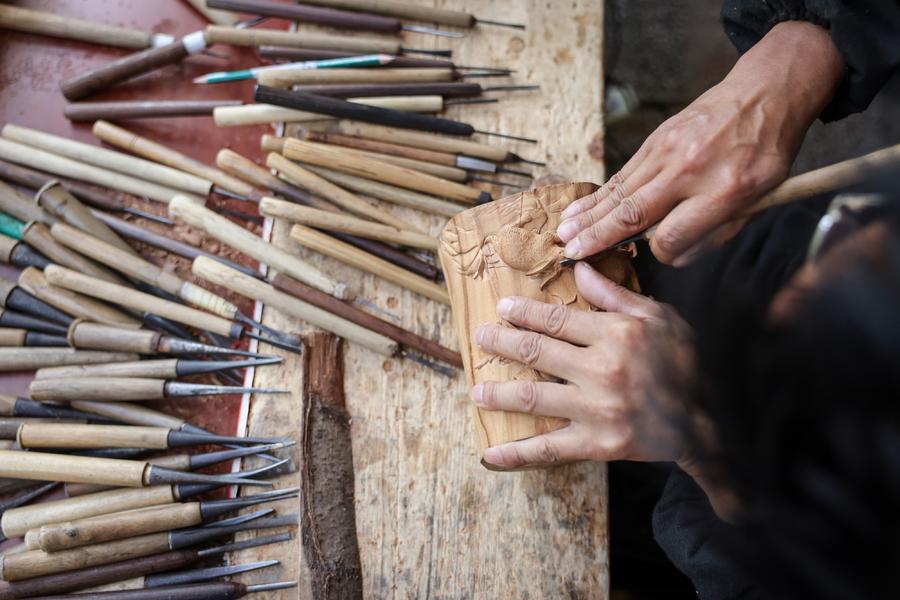 手工雕刻笔筒,需要用到大小不同的刻刀。