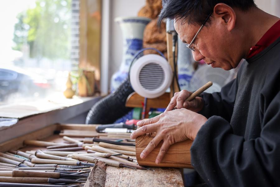 王来新的工作室内,刘启洪正在手工雕刻笔筒。