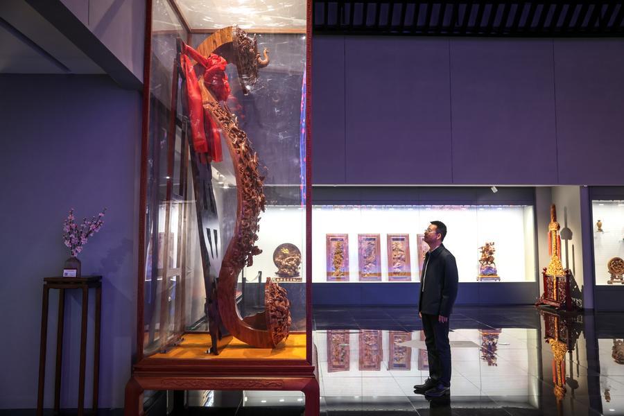 肥城市民中心内有专门的展厅展示桃木工艺品。