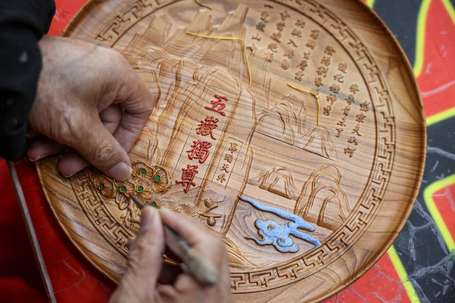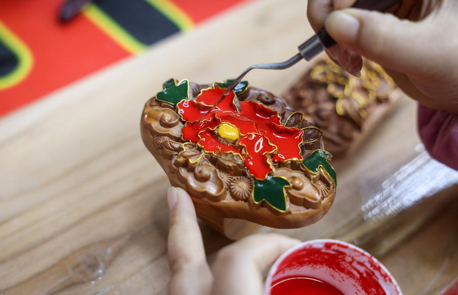 曹演铭用掐丝工艺制作桃木盘。