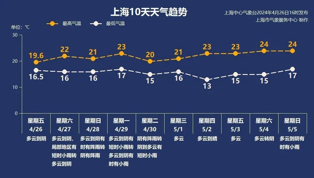 上海五一假期以前雨水依旧频繁。受高空短波槽东移影响,28日和30日将各有一次降水过程。五一假期期间,总体是多云为主的好天气!气温较平稳,保持在13~24℃之间。气象条件总体比较适宜出行。