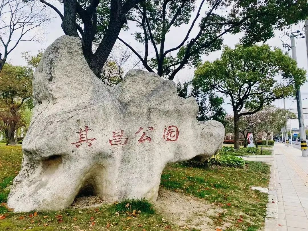 其昌公园位于嘉松南路与南期昌路交叉口东北角。这里植被覆盖率很高,园子以英伦风格的长廊、尖顶亭等建筑为特色。以绿、白、红为主色调,将园林小品和绿化融为一体。