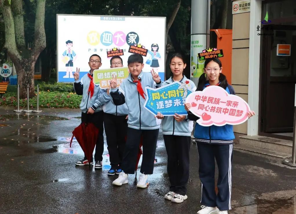 上海同学们早早就在学校门口列队迎接喀什的小伙伴,手上拿着“同心同行,筑梦未来”“中华民族一家亲,同心共筑中国梦”标语,头上带着刻有新疆同学名字的头冠,让喀什的小伙伴倍感温暖。