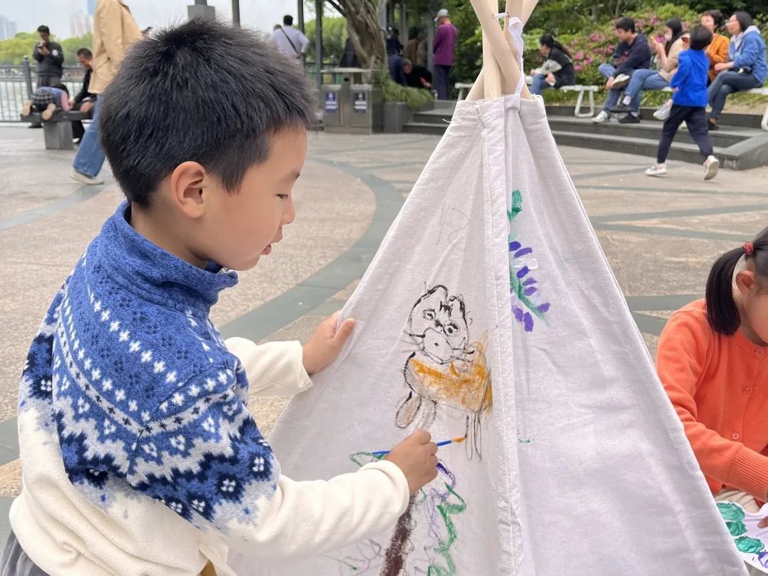 随后,亲子家庭分组合作,合力搭建家风小帐篷,帐篷不仅是遮风避雨的所在,也是“家”的象征,孩子们用色彩捕捉黄兴公园紫藤花的美景,一笔一画丰富这个亲手所搭的“小家”,每一顶帐篷都映照着家风的温暖,盛满了家人间的互助互爱。