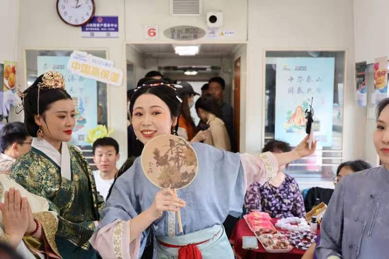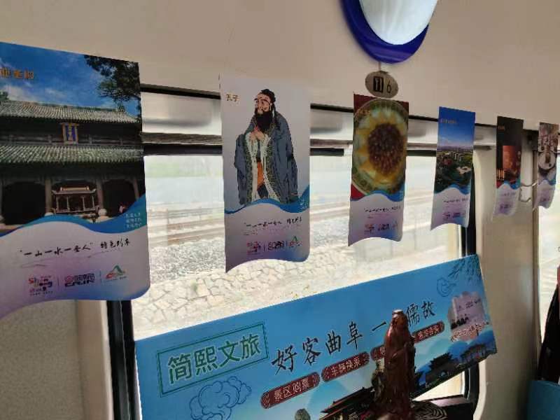 走进车厢,来自济南的清照诗词、曲阜的开笔礼、泰安的泰山宝训诵读、茶艺等特色表演,鲁班榫卯、传统拓片、儒家布艺、糖人制作等多种非遗手造吸引旅客驻足赏玩;国铁国潮、“五常”书签、国学竹简等多种旅游文创产品,泰山煎饼、曲阜汉服、平阴玫瑰等山东好品也在上车向旅客展示。