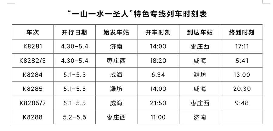 记者从中国铁路济南局集团有限公司(以下简称“国铁济南局”)获悉,4月30日14时,K8281次列车从济南站驶向枣庄西站,这是国铁济南局开行的首趟“一山一水一圣人”特色专线列车。