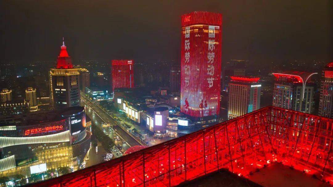 景观灯光以“劳动创造幸福,实干成就伟业”为主题,通过灯光、音乐、画面,展现了劳动者的风采和精神风貌,向劳动者们致以崇高的敬意,激发全社会对劳动者的尊重和关爱。
