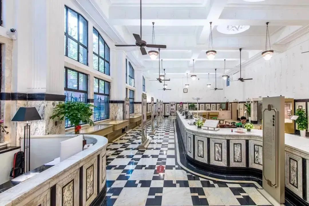 进入大厦,仿佛来到了百年前的上海。一层大厅保留了当时银行使用的状态,楼里曾轰动上海滩的24米白色云石柜台还保留着。大家也可以自行体验打算盘记账等工作。建筑本身也很有看头,采用了大量现代主义风格元素。还有室内的白色旋转楼梯,适合拍照打卡,非常出片。