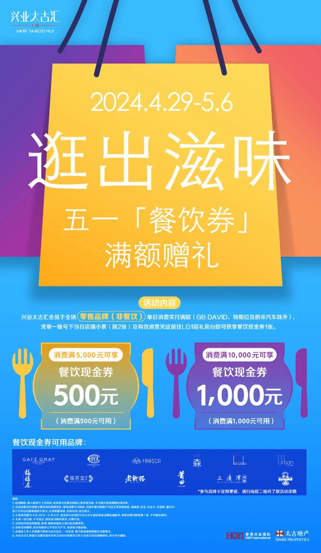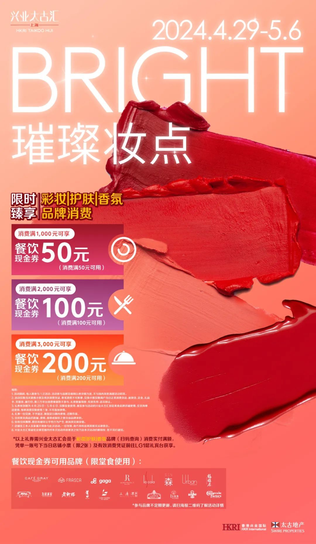 为进一步丰富“五一假日菜单”,兴业太古汇即日起至5月6日携手全场零售品牌推出满额赠礼活动,消费满额可享最高达1000元的餐饮现金礼券,探寻味蕾惊喜。针对美妆爱好者,兴业太古汇特别携LG1层Beauty Avenue继续加码“璀璨妆点”促销活动,消费者在场内美妆品牌单日消费满额,即可领取不同档位的餐饮现金礼券,尊享贴心礼遇。