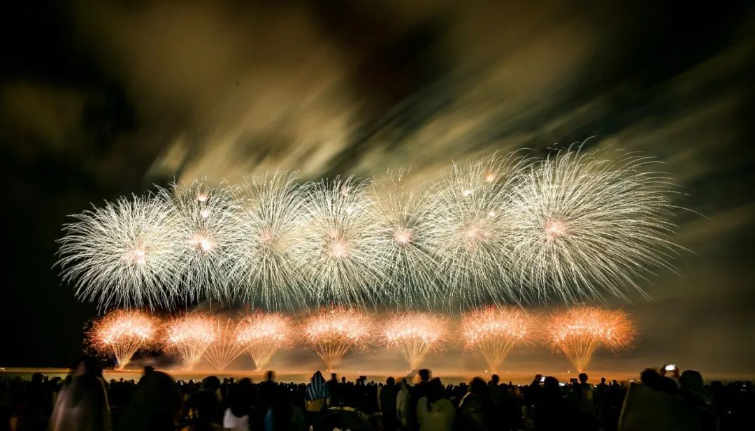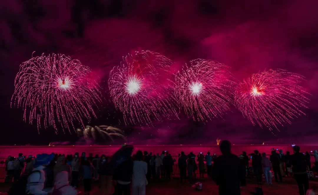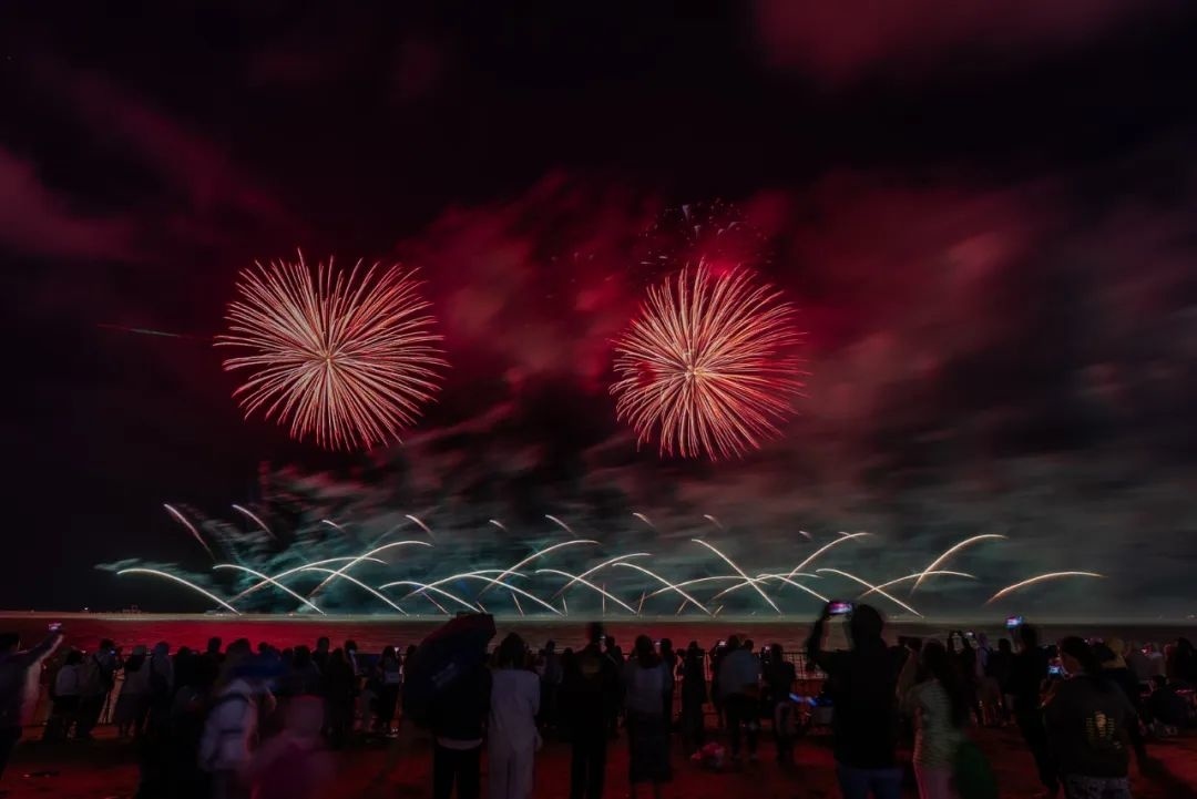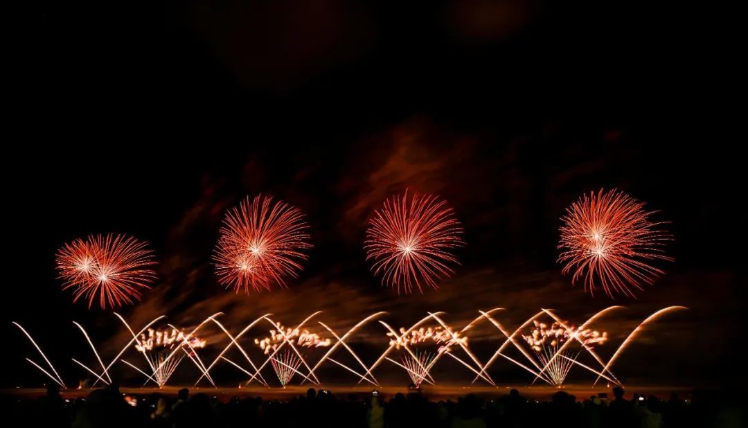 音乐烟花节演出以浩瀚夜空为画布,以绚烂烟花为画笔,在水上、低空、中空、高空描绘出一幅立体烟花美丽画卷,演绎出美妙浪漫的“海上声光秀”。在场市民游客共赏灿烂夜空,一同享受了一场花火与音乐交织的海上声光秀。