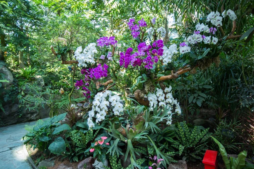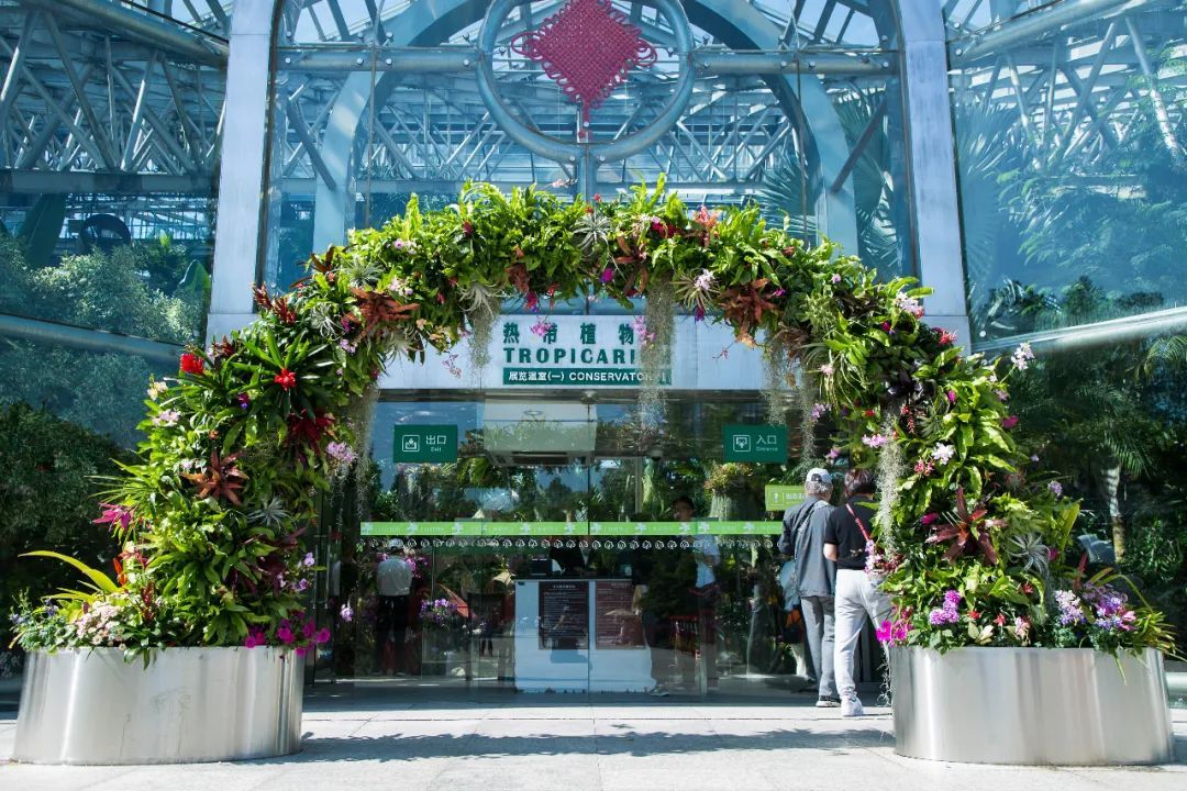 这两个区域均以兰科、凤梨科为主角进行布置。为确保稳固性,在室外平台上定制的拱形构筑物两侧各增加了一个花箱。在植物配置上,着重融入较多正值花期的兰花以及凤梨,整体颜色更加靓丽,观赏性更强。