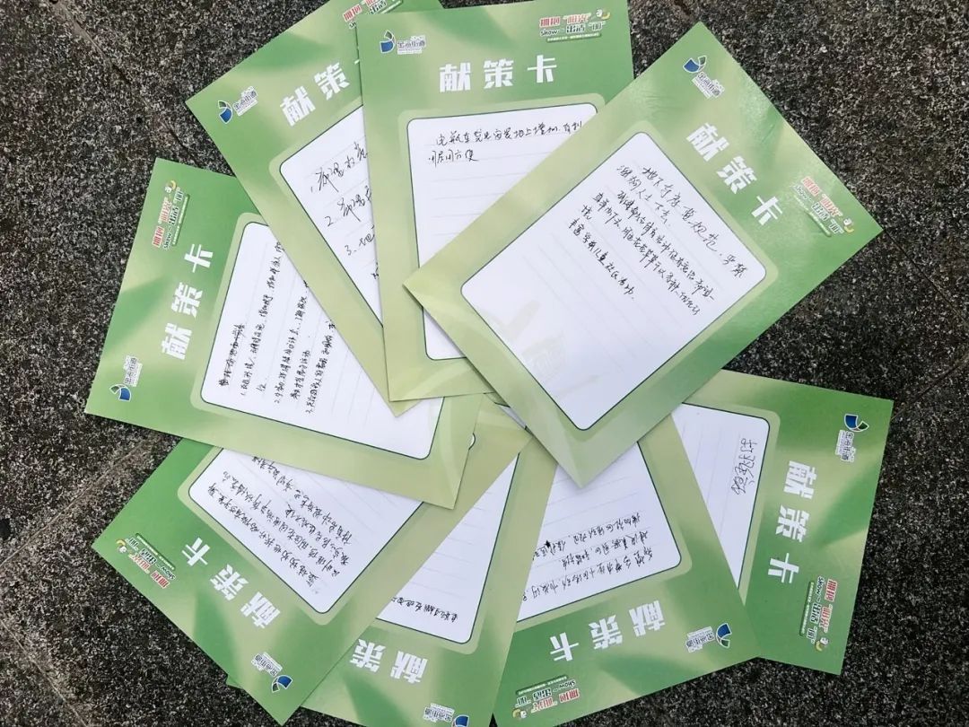 打卡集章完成后,由每组的队长在集章卡背后建言献策,把对小区建设的憧憬或自己的意见和建议写在卡片上,积极参与到社区建设中来。