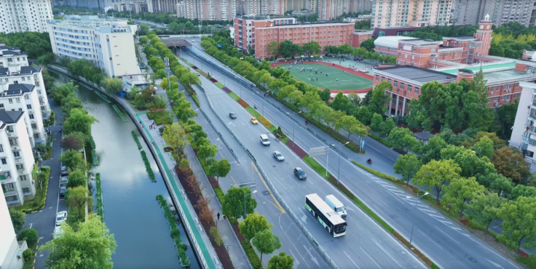 万里滨水活力带有效贯通了大场浦沿岸的居民区与商业、办公空间,提升了居民到达周边文化服务设施的便利度,形成“一环三带”(大场浦水环、中央公园绿带、新村路星光漫步带、万泉路绿带)慢行步道,实现开放共享的大场浦“休闲之河”,于无形之中,以自然为底蕴,调和出独有的城市人文情怀。