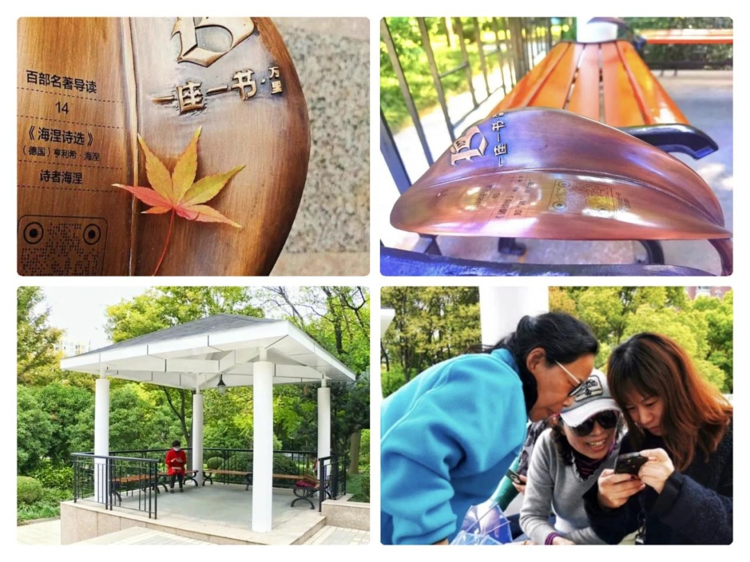 万里街道“一座一书”项目,以万里公园中的座椅为载体,在座椅上树叶形状的异形扶手上嵌入导读链接,人们可以通过扫描二维码品读百本名著,既能休憩,也能感受文化的魅力。