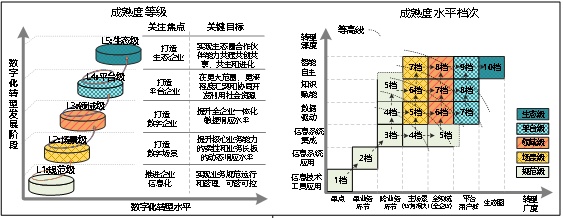 依据数字化转型成熟度模型,数字化转型可分为规范级、场景级、领域(企业)级、平台(产业链/供应链)级、生态级等五个螺旋式跃升的发展阶段,并按照转型的广度和深度将五个发展阶段细分为十个水平档次。