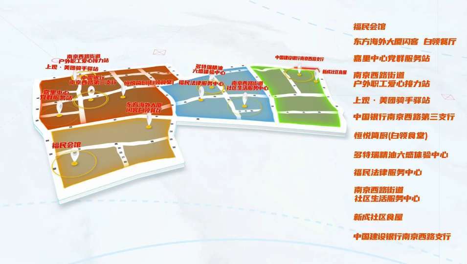 为深入整合辖区各方资源,加强“两企三新”党建工作,近日,南京西路街道“新就业群体服务地图”正式发布,将进一步推动街道对新就业群体的关心关爱服务向工作地、楼门口、家门口、休憩点延伸,全路程、全天候地助力新就业群体融入南西。