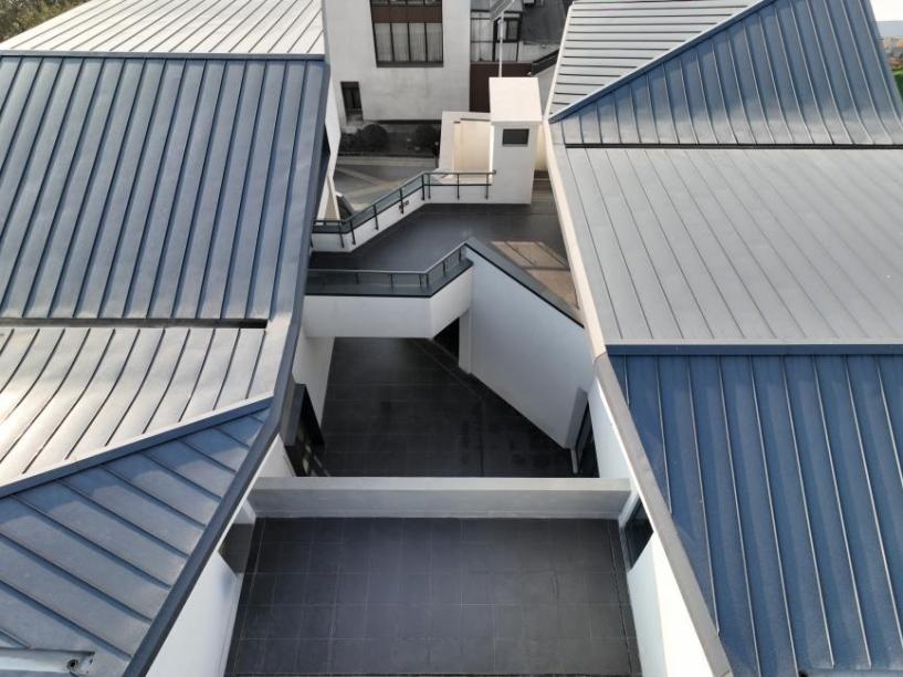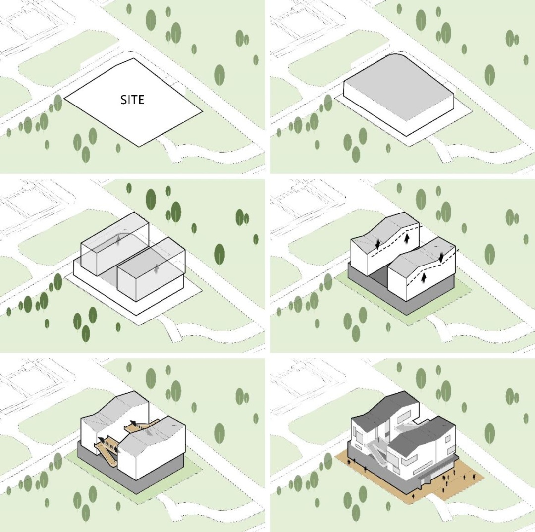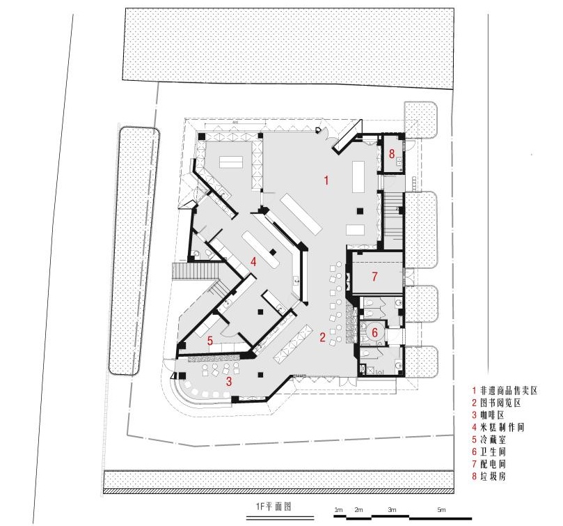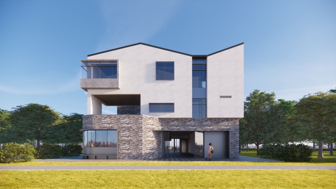 为呼应周边民居形式,屋顶采用传统与现代结合的折面坡屋顶,变异的坡屋顶,开辟出中庭空间,让更多交流的在中庭中发生。