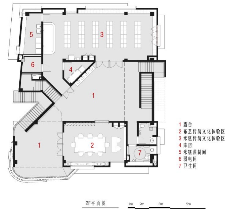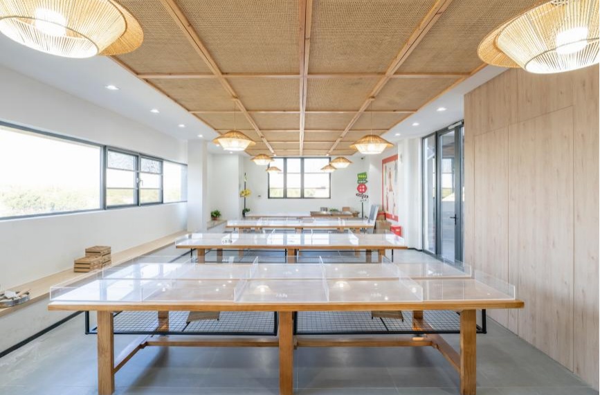 建筑一层设置了软糕文化体验工坊,主要容纳米糕制作、展卖和咖啡书吧的活动,我们设置的米糕展卖区,以及米糕生产工坊,可供8名当地居民在这里工作、制作米糕;在咖啡书吧区,除了咖啡,还供应以松江大米为原料的特色米饮,提供给居民休闲。