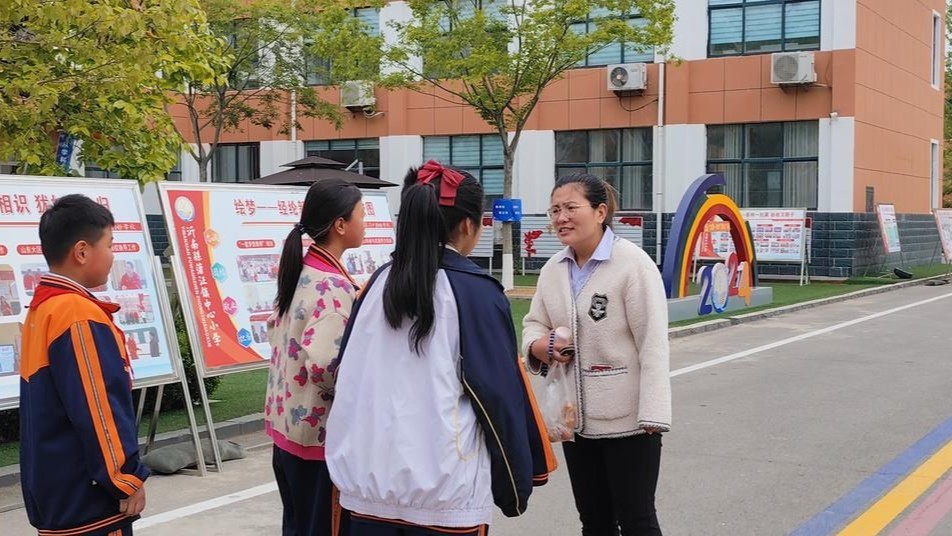 沂南县蒲汪镇中心小学联小校长薛娟喜(右)正和孩子们交流。