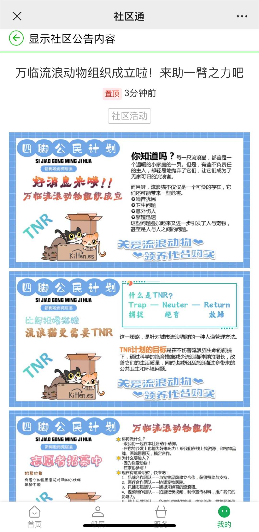 小区内年轻的爱猫人士在社交平台上创建流浪猫救助账号——“临家de猫”,发布猫咪生活照片、视频、故事,积极分享、转发、评论,让更多人了解并参与到救助行动中来。社区创作达人还量身定制了专属猫咪IP,拍摄“流浪猫眼中的淞南”短视频,让淞南更显温度。