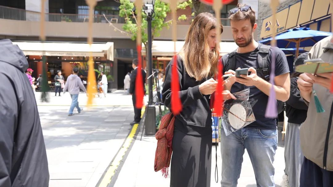 市民们穿梭在市集之间,欣赏着精美的手工艺品,感受着传统文化的魅力。数十个非遗文化体验摊位前,其中一项以颜料依附在水面作画的非遗体验漂漆吸引了不少市民驻足,大家对颜料滴在水面、印在扇上的技艺赞叹不已。
