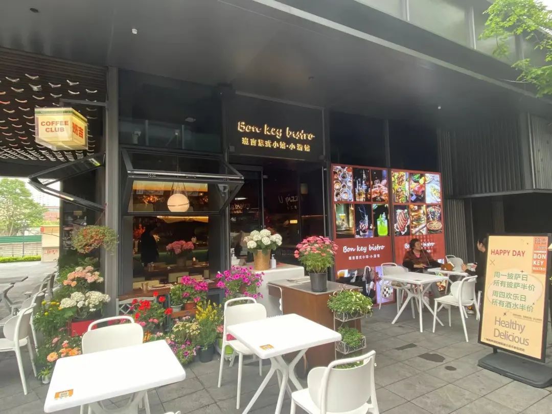 走近位于龙华会的班吉意式小酒馆,你会看到高低错落的各色花卉和香草,清香扑鼻,雅致迷人。几张白色的外摆桌椅整齐排开,转角一只有着店家招牌的装置灯在风中摇曳,在这里就餐,好不惬意。