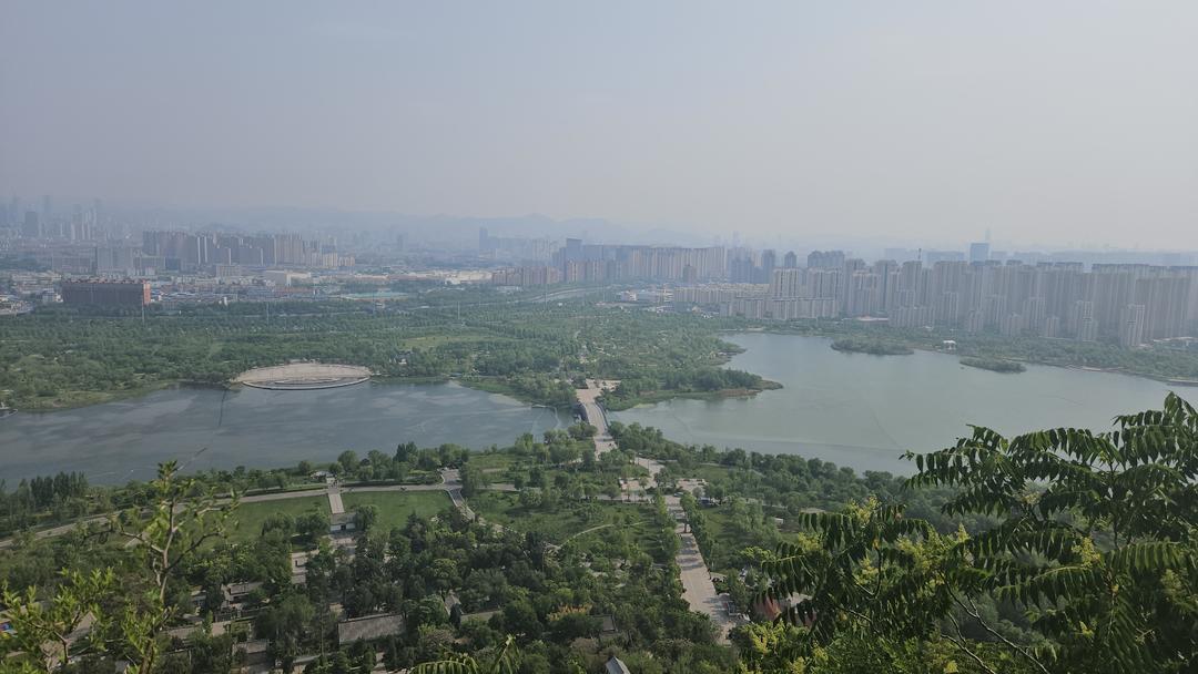纵然此时山路陡峭,山间绿植青翠茂盛,藤攀蔓连,依然使人意趣丛生。每到一处平台休息点驻足远望,山下成片的绿地和水域越发显露出全貌。千年前,诗仙李白攀登华山时看到的美景,也大抵如此。