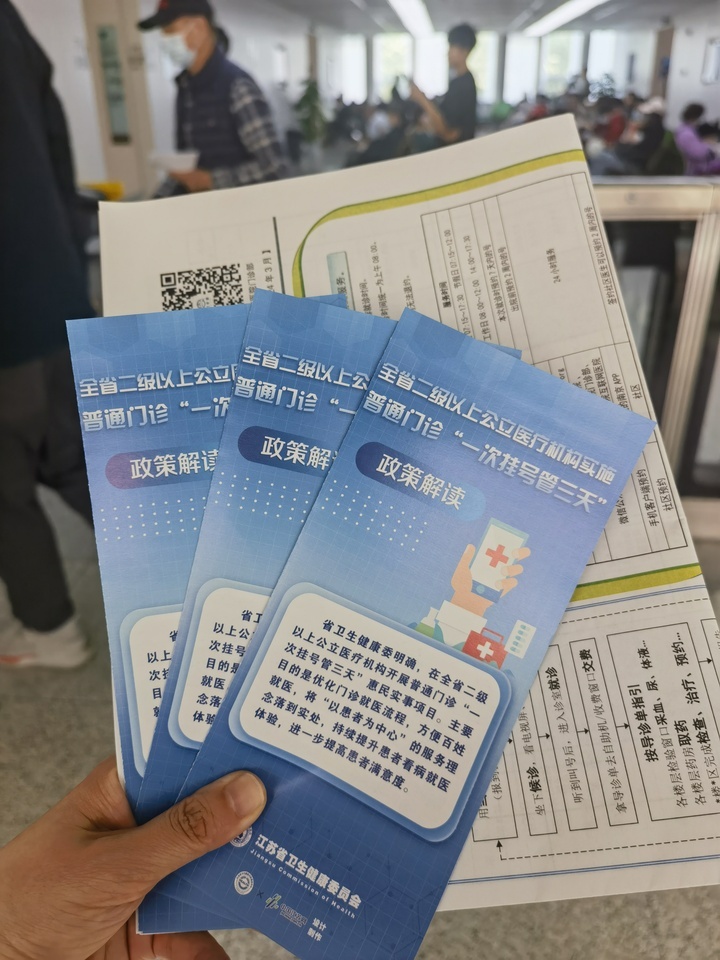 近日,江苏省二级以上公立医疗机构开展普通门诊“一次挂号管三天”惠民实事项目。这意味着,患者到省内二级以上公立医疗机构挂普通门诊号就诊时,如因检验或检查当天不能完成或者不能获取报告,尚未完成诊疗,三天内可携带报告结果到同一医院的同一院区、同一科室复诊,无需再次挂号,享受免缴普通门诊诊察费(挂号费)政策。