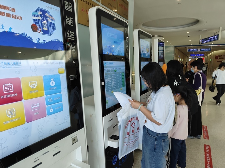 苏州大学附属儿童医院为检验检查项目明确的患儿开通了检验检查诊前自助开单服务,家长取号后可以自行在自助服务机上给孩子开诊断明确的、常规的检验、检查项目。“一般孩子发烧去医院,常常需要血常规检查。现在不需要医生开具化验单,家长挂号后可以自助完成开单、缴费等项目。”成永介绍,一系列流程的优化极大地提高了就诊效率。