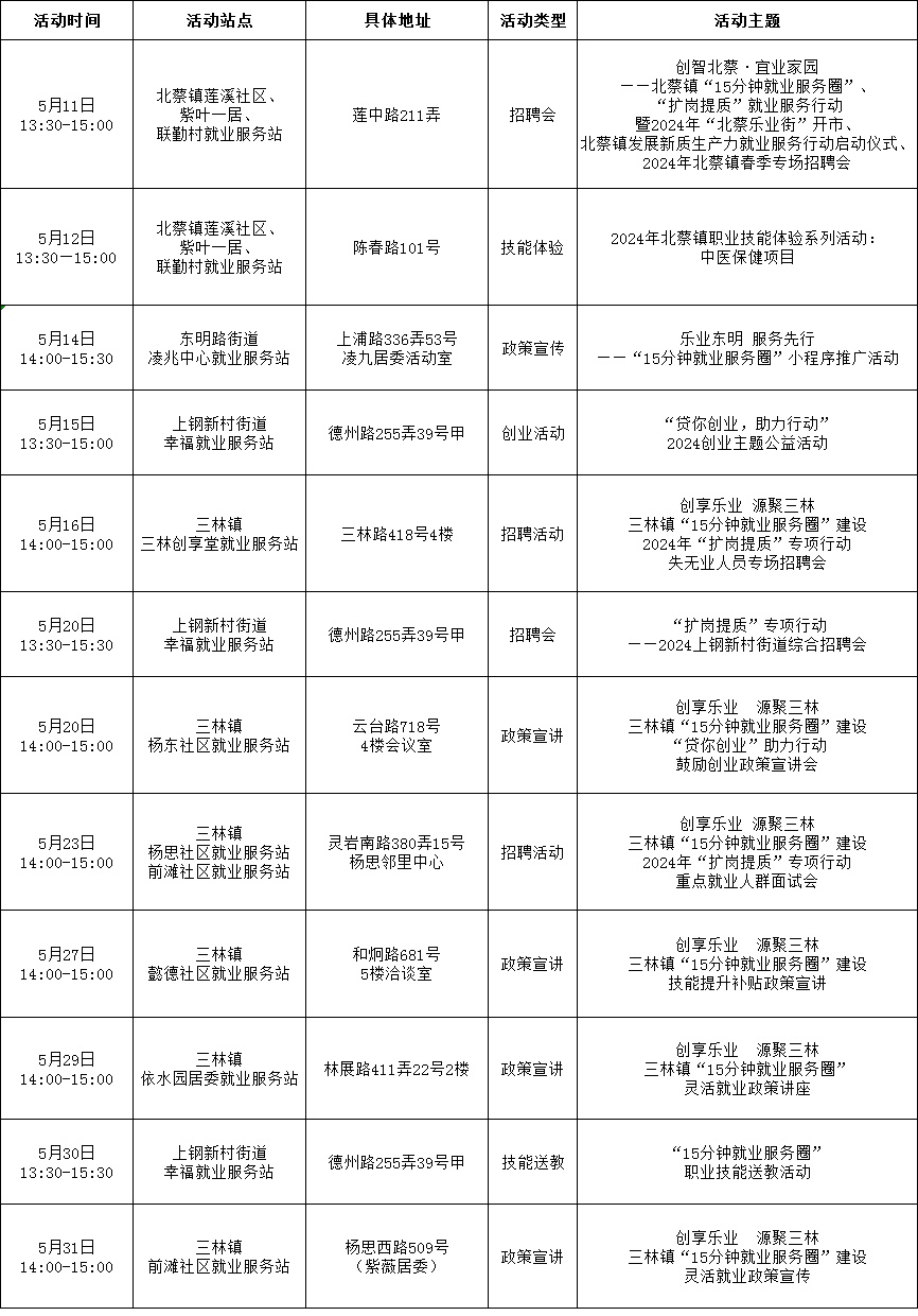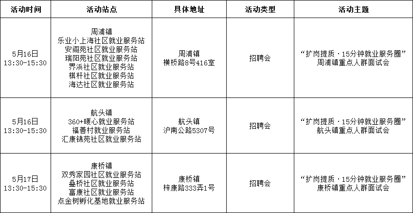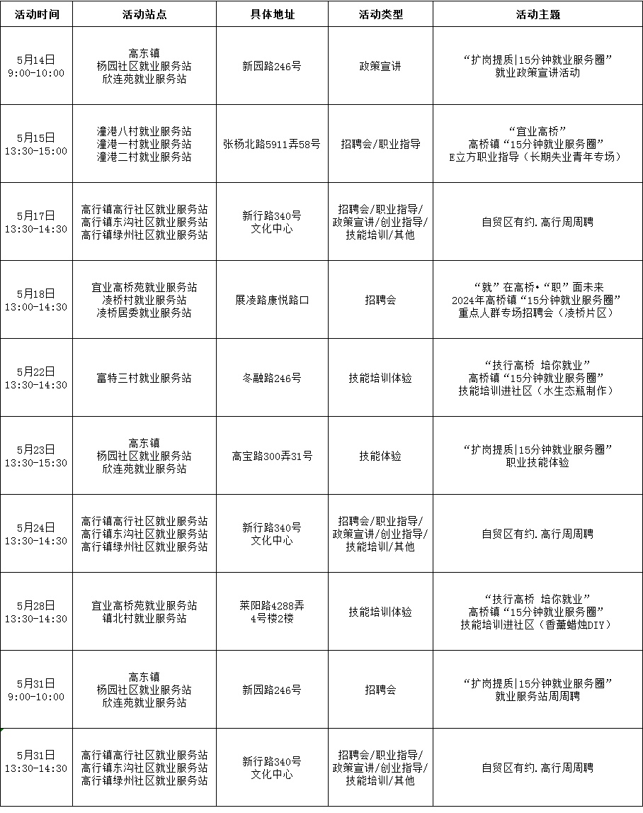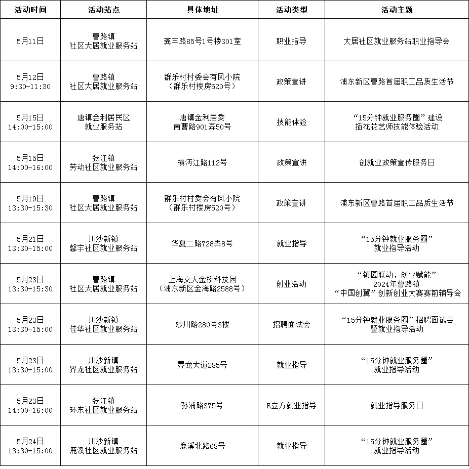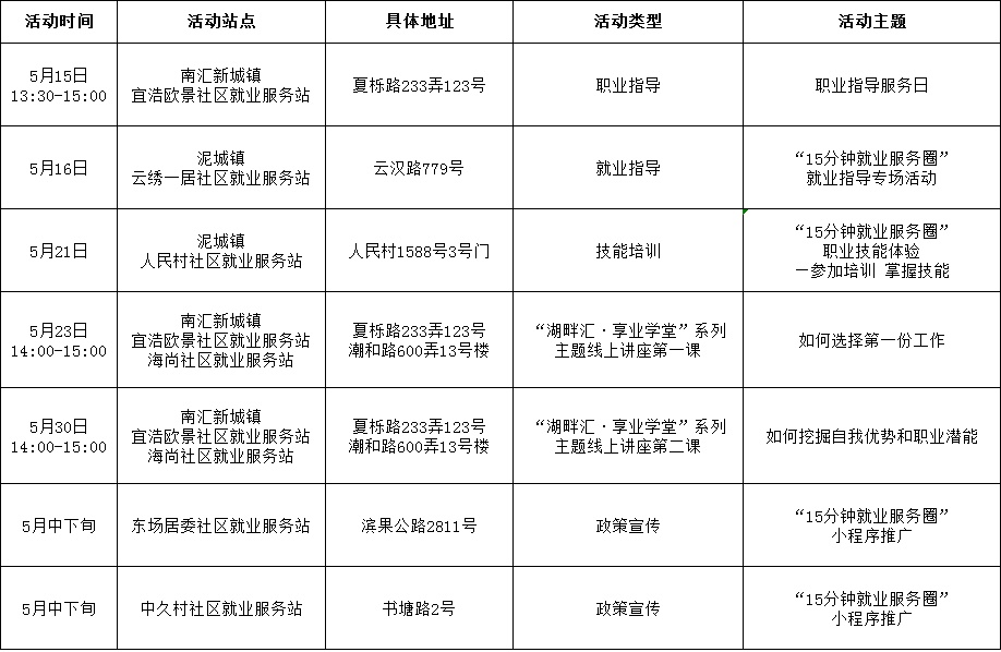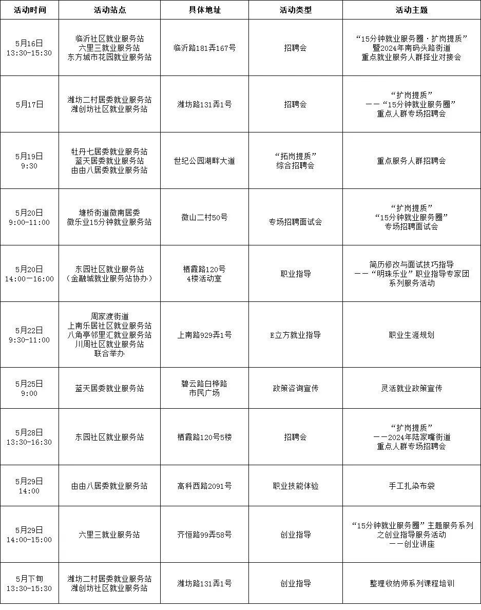 为全面推进浦东新区“15分钟就业服务圈”建设,加强高校毕业生、就业困难人员等重点群体就业帮扶,使服务阵地延伸到家门口,把就业服务及时送到社区居民手中,浦东新区“15分钟就业服务圈”社区就业服务站持续开展丰富多样的活动,5月有100多场活动等您来参与!