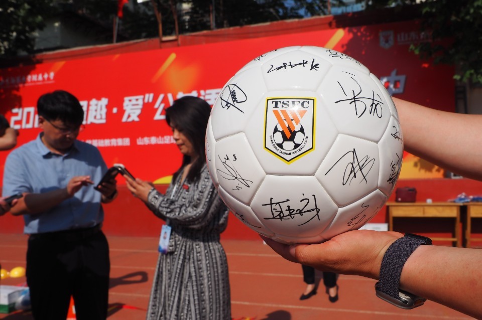 山东泰山足球俱乐部、山东省体育记者协会向学校赠送了签名足球、纪念球衣等足球训练设备和功能性饮料。