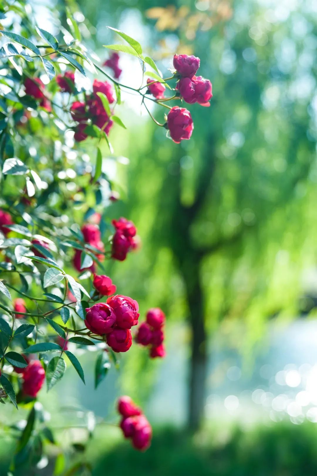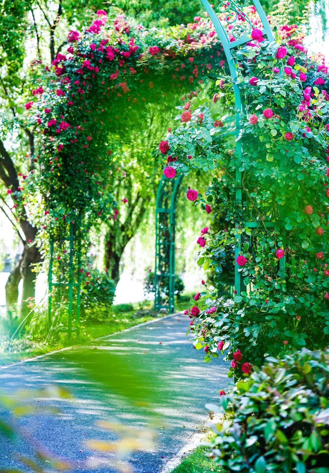 色彩缤纷的“花廊”,开满了层层叠叠的蔷薇、月季,有粉的、红的、紫的……在悠悠垂柳的掩映下愈显静美,多姿多彩。