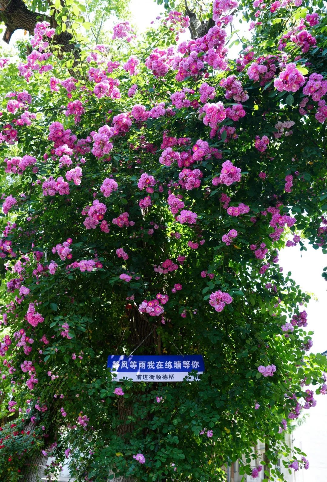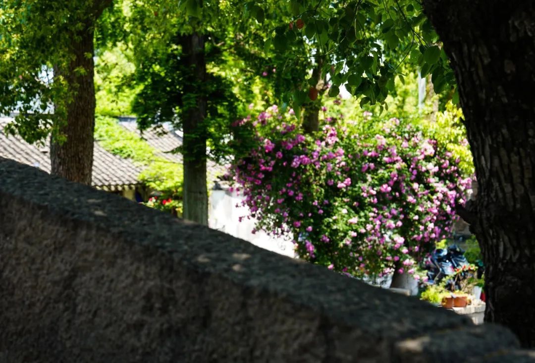 攀爬而上的蔷薇花开满枝,十分壮观。一朵朵粉色花朵相拥而簇、高低错落,如瀑布般垂下来,童话感十足,也为“高屋窄巷对街楼,小桥流水处人家”的练塘老街景致增色不少。