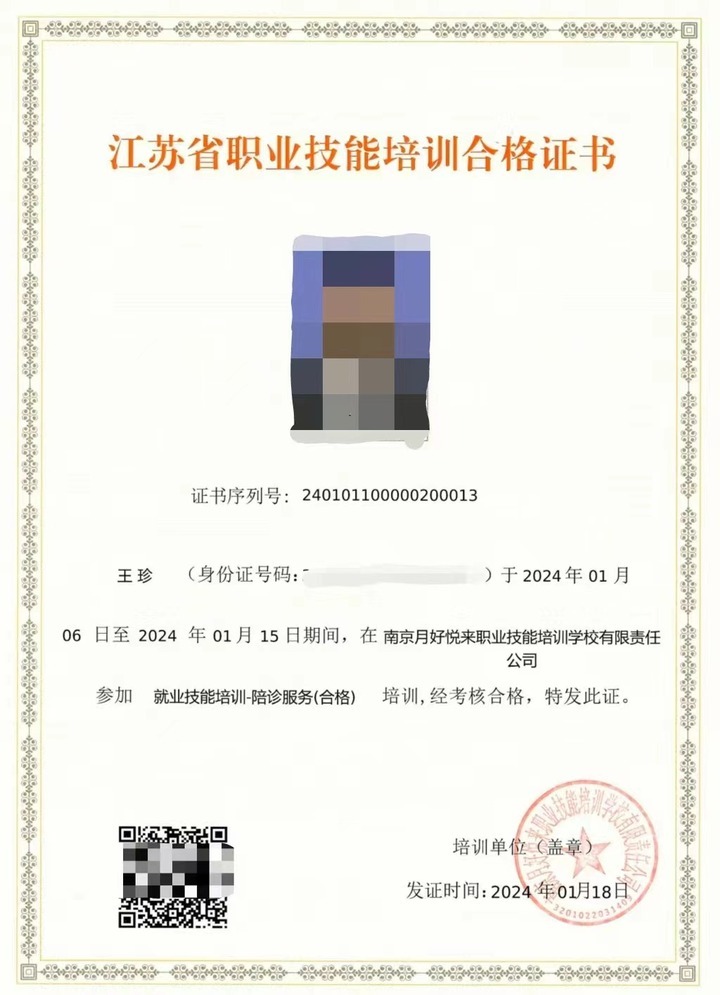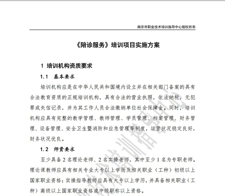 南京市职业技术培训指导中心副主任周业勤介绍,去年他们委托南京月好悦来职业技能培训学校完成了陪诊服务培训标准制定、培训课程研发,并制订完善了相应的培训就业服务体系。