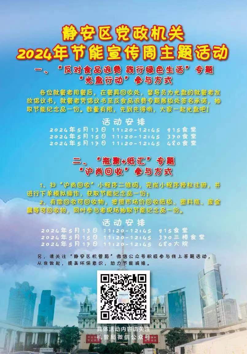 此外,静安区将在5月13日至5月17日开展党政机关2024念节能宣传周主题宣传活动,以实际行动践行绿色生活理念。