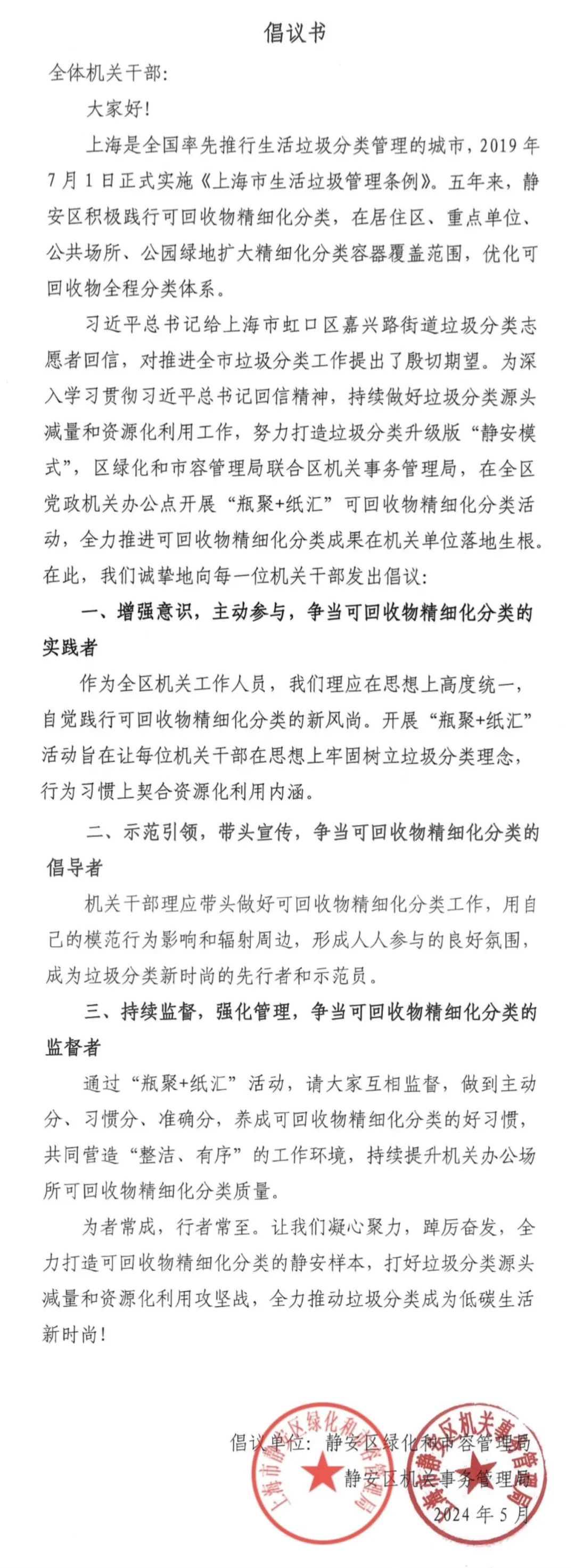 为进一步推动垃圾分类和资源化利用,促进静安区可回收物精细化分类工作向纵深发展,优化可回收物回收服务品质,提升精细化管理水平,加快落实《上海市持续优化生活垃圾全程分类体系工作方案》和《静安区持续优化生活垃圾全程分类体系工作方案》,在市绿化市容局的指导下,静安区绿化和市容管理局联合区机关事务管理局,在全区机关集中办公点设置了200余组“瓶聚+纸汇”可回收物精细化分类废物箱,实现全区党政机关办公点可回收物精细化分类全覆盖,打造了静安区可回收物精细化分类示范新标杆。